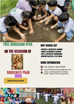 🎉 Enroll Your Little Star Today! 🎉 ✨ FREE Admission Until Saraswati Puja!✨ 🌟 Play Group | Nursery | LKG | UKG 💡 We Make Learning Fun & Prepare Kids for a Bright Future! 🎨 Activities & Learning: ✅ Play-Based Learning ✅ Yoga, Music, Dance, Karate & Swimming ✅ Healthy & Delicious Meals ✅ Caring & Trained Teachers ✅ Full-Day Care for Busy Parents 📍 Visit Us: Opposite Nepal Telecom Office, Birtamode-05, Kankai Road, Jhapa ✅ 📞 Call / WhatsApp: 9860206431 /023-532540 / 9861335697